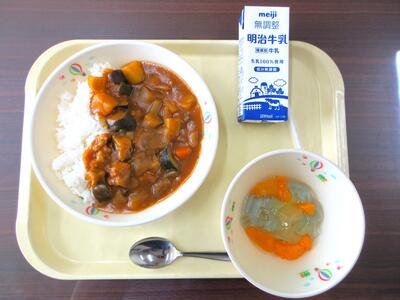 今日の献立は「ご飯、牛乳、夏野菜カレー、カットゼリー」です。おいしくいただきました。