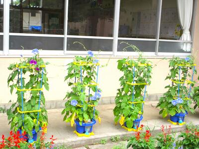 1年生が生活科で育てているアサガオの花が、たくさん咲きだしました。