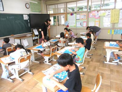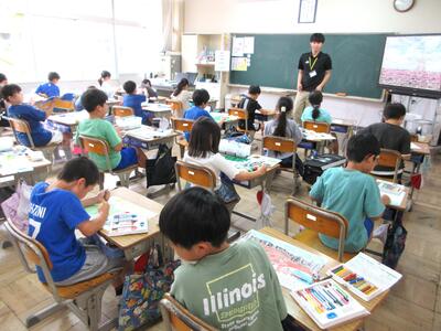 3年生の図工では、みんな集中して丁寧に着色していました。