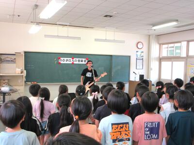 今日の昼休みとなかよしタイムは、子どもたちが大好きな「のぶおばんど」ののぶおさんが来てくださり、ミニ音楽会を開いてくださいました。(2・4・6年生と1・3・5年生の2部制)