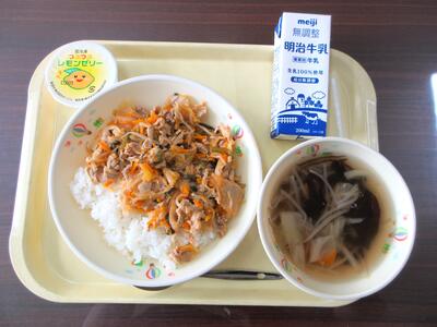今日の献立は「豚キムチ丼、きくらげのスープ、牛乳、レモンゼリー」です。おいしくいただきました。
