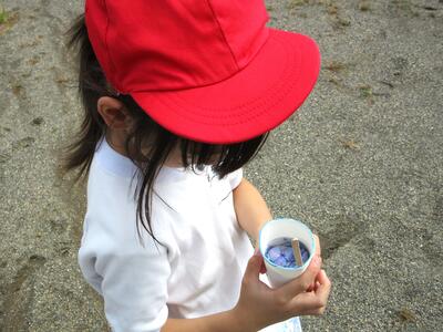 1年生の生活科では、シャボン玉や水でっぽう、砂遊びなどで遊びました。