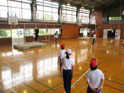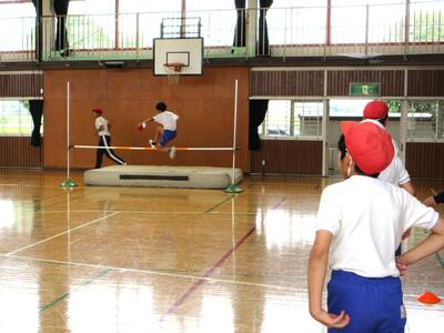 6年生の体育は、体育館で走り高跳びの授業です。自分で挑戦する高さを選んで練習していました。