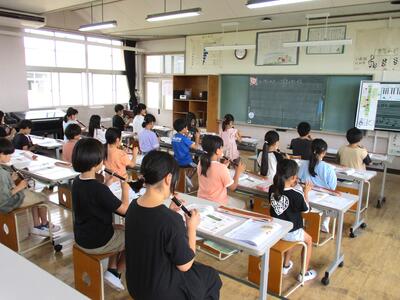 5年生の音楽では、グループで次時に音楽室で演奏をするために、リズムに気を付けながら練習をしています。