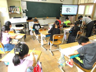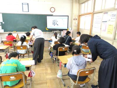 2年生の国語では、漢字の学習です。漢字の読みや筆順を確認して、ドリルに書き込んでいます。