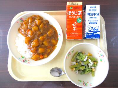 今日の献立は「ハートカレー、ご飯、はな野菜とハートパスタのサラダ、ほうじ茶または牛乳」です。「みんなが食べられるメニュー」でした。