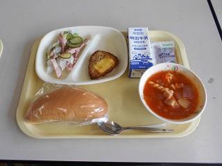 今日の給食は、コッペパン、けんさんいちごジャム、牛乳、チキンチーズやき、だいこんサラダ、ミネストローネです。高根沢町で生産されたものは、だいこん、きゅうり、玉ねぎです。今日もたいへんおいしく頂きました。