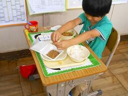 今日の給食は、ごはん、牛乳、なっとう、もやしときゅうりのキムチあえ、こんさいじるです。高根沢町で生産された物は、みそ、きゅうり、こめです。今日もたいへんおいしく頂きました。1年生には、給食で初めてのなっとうです。毎年のことですが、1年生の初めての納豆の時は、みんな苦労して開けて、タレをかけて、混ぜて、ベタベタになりながら食べています。さて今年は、どうなるか少し見に行きたいと思います。