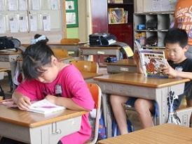 今日の朝は、4年生の教室で朝の会から1時間目を担当してきました。登校してから朝の会が始まるまでの時間で、読書をするのが本校の約束になっていますが、なかなか上手くいっていません。そんな中、4年生教室で写真のような素敵な風景が見られましたのでお知らせします。真剣に読書している2名でした。(付け足しですが、朝黒板に文字を書いているときに、「校長先生、字が上手ですね」とある女の子に声をかけられました。この年になっても、褒められるのはうれしいものです。)