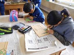 今日の3時間目に、6年生の図工の授業を見てきました。先日お知らせした版画の授業の続きで、彫りが進んで終わった順に刷りに入っていました。さすがに6年生ですので、手際よく刷ってなかなかの作品が刷り上がっていました。この後、裏から絵の具で色をかける予定だそうです。どんな作品に仕上がるのかとても楽しみです。