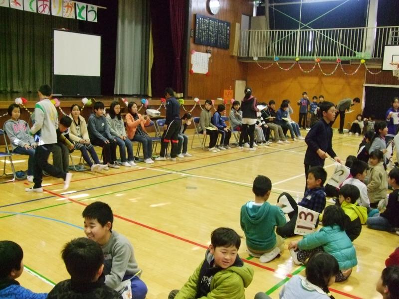 5年生以下の子どもたちが、なかよし班活動などでお世話になった6年生とのお別れの場をもちました。企画委員会を中心に時間をかけて準備して実施したゲームやプレゼント、そして替え歌での「ひまわりの約束」など、心のこもった送る会でした。