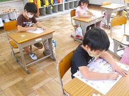 今日の3時間目に、1年生の図工の授業も見てきました。「やぶいた かたちから うまれたよ」の単元で、折り紙や新聞紙、画用紙をいろいろな形に破いて、それを台紙に貼り付けて思い思いの絵や模様を仕上げていました。みんな真剣な表情で破いたり貼ったりしているのがとても印象的でした。(今日は残念ながら1人欠席なので22名です。早く元気になって学校へ登校してきてください。)