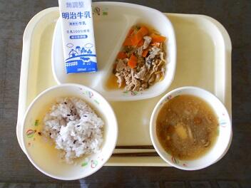 今日の給食は、ごはん、牛乳、ごぼうたっぷりかきあげ、てんどんのたれ、むらくもじるです。高根沢町で生産されたものは、こめです。今日もたいへんおいしく頂きました。