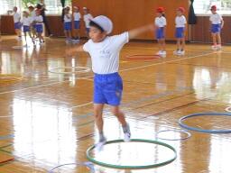 今日の2時間目に、2年生の体育の授業も見てきました。「ケン・ケン・パ、ケン・パ、ケン・パ、ケン・ケン・パ」のリズムに合わせて輪をとぶ活動をしていまいた。途中で自分たちで輪の幅を変えたりして、みんなとても楽しそうに取り組んでいました。(暑さ指数(WBGT(湿球黒球温度)を計測して実施しています。)