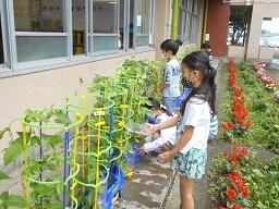 金曜日の1、2年生の下校の時、2年生の女子が、「校長先生、1個あげます。」と言って生活科で大切に育てたミニトマトを1個差し出してきました。お母さんに言われたようですが、初めて収穫した4個のうち1個をくれました。この女の子の気持ちがうれしいですね。この2年生女子と声をかけたお母さんにいいとこめがね21決定です。その後、職員室で少し自慢をしました。
