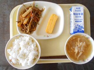 今日の給食は、かみかみメニューで、ご飯、牛乳、厚焼き卵、五目きんぴら、大根と油揚げの味噌汁です。高根沢町で生産されたもは、みそ、にんじん、だいこん、ねぎ、こめです。今日もたいへんおいしく頂きました。