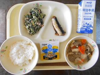 今日の給食は、節分メニューで、ご飯、牛乳、いわしの梅煮、春菊のツナ和え、根菜のごま汁、福豆です。高根沢町で生産された物は、しゅんぎく、にんじん、キャベツ、だいこん、こめです。今日もたいへんおいしく頂きました。