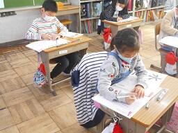 今日の2時間目に、3年生の書写の授業を見てきました。「これまでに学習したことを確かめて書こう。」というめあてで、みんなしっかりした文字を書いていました。先日お知らせした、「水玉」の作品が掲示されていましたが、みんなともて上手に仕上げられていました。