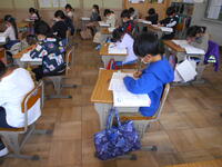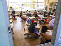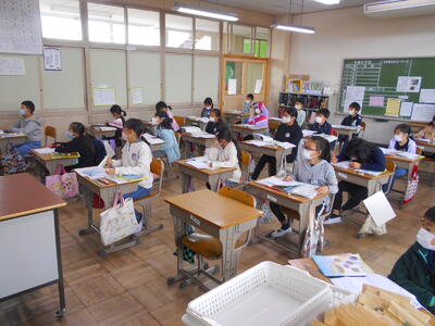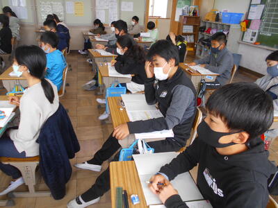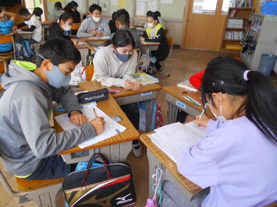 先生の説明をよく聞きながら、道徳ノートに書き込んでいます。