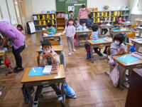 着任式と始業式はリモートで行い、児童は各教室でテレビ画面を通して参加しました。