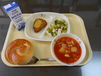 今日の給食は、ご飯、牛乳、春巻、ブロッコリーとしめじのサラダ、キムチスープ です。