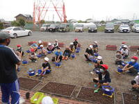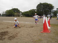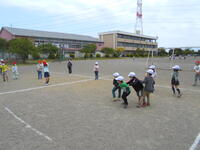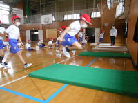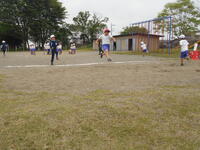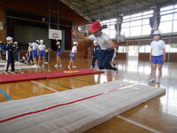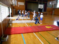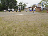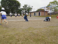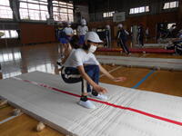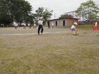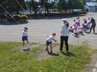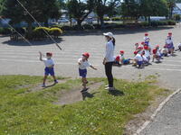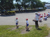 ロープに通したバトンを投げて、ボール投げの練習です。