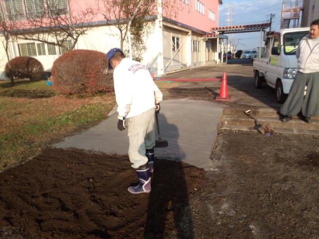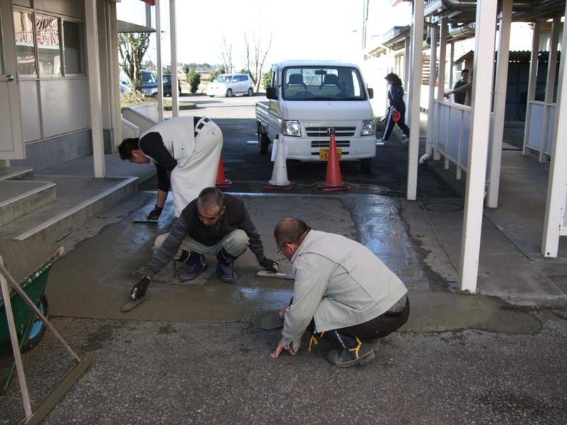 本校では、昨年度から部分的にバリアフリーの場所を増やしています。今回は教育委員会の支援で、体育館通路と校庭に抜ける階段をスロープ状にしていただきました。環境サポート隊の大橋さんにもお手伝いいただきました。