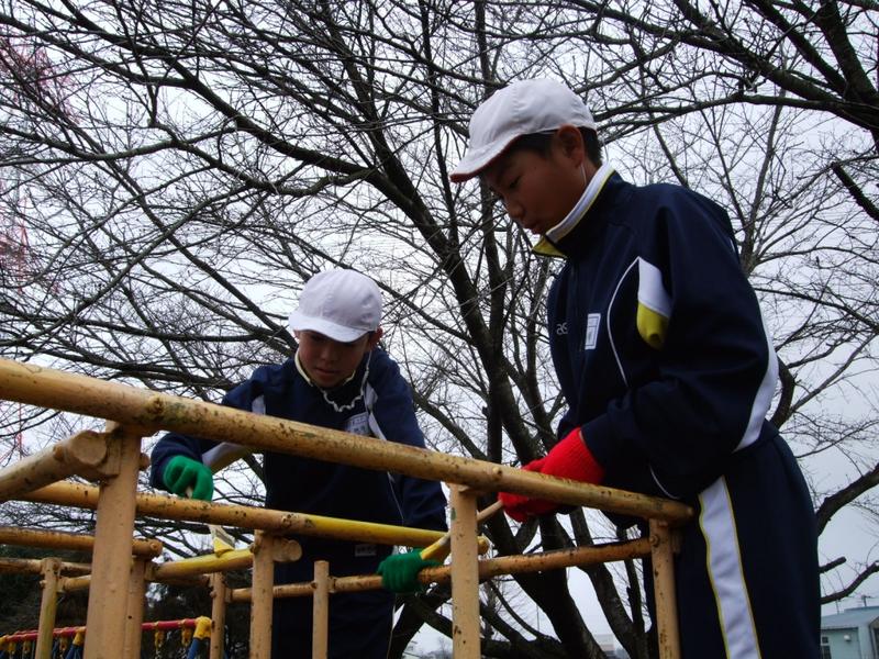 6年生の奉仕作業で、最後まで時間を費やしたのが、遊具のペンキ塗りです。体のあちこちに色を付けてしまいましたが、遊具が見違えるほどきれいになりました。本当にありがとう。
