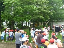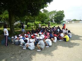 昼休みの後の中央タイムに実施しました。縦割り班ごとに、中央の森に