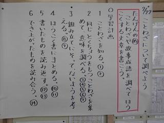 今日の3時間目に、3年生の国語の授業も見てきました。ことわざについての学習で、ことわざには3つの特徴があって、その中から自分が調べたい特徴を決めて、国語辞典やことわざ辞典を使ってその特徴のあることわざを調べるという内容でした。子どもたちと立てた14時間分の学習計画が掲示され、先を見通すことができる学習に、子どもたちは意欲的に取り組んでいました。