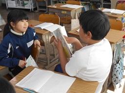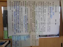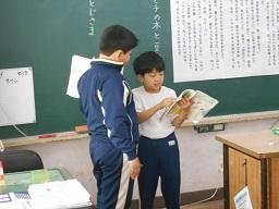 今日の3時間目に、3年生の国語の授業も見てきました。3年生最後の物語教材できっと保護者の方もご存知の「モチモチの木」でした。めあては「2の場面を読み、モチモチの木と豆太、じさまの関係を読み取ろう」でした。個人で考え、その後友だちと意見交流をして、発表しながらまとめていくというスムーズな流れでした。その中で、わからない言葉があればすぐ国語辞書を引く、ふりかえりたいときは前時の学習で作った模造紙の教材文を見る、さらに動作化を入れるなど、子どもたちが教材文に引き込まれていく工夫がいろいろされているすごい授業でした。