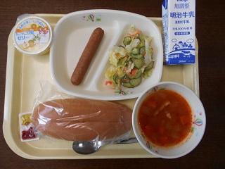 今日の給食は、セルフドック(コッペパン、ウインナー、トマト&マスタード)、牛乳、フレンチサラダ、ミネストローネ、にっこりなしゼリーです。本日の給食で高根沢町で生産されたものは、にんじん、だいこんです。今日もおいしく頂きました。