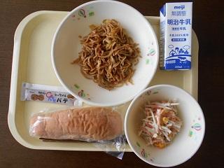 今日の給食は、コッペパン、キャラメルクリーム、牛乳、やきそば、ごぼうサラダです。本日の給食で高根沢町で生産されたものは、にんじんです。今日もおいしく頂きました。