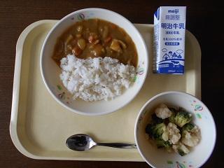 今日の給食は、みぎごはん、牛乳、チキンカレー、ブロッコリーとしめじのサラダです。本日の給食で高根沢町で生産されたものは、にんじん、こめです。今日もおいしく頂きました。