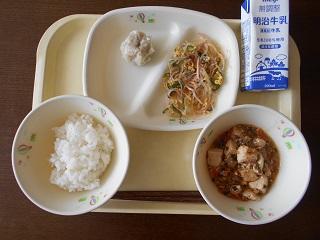 今日の給食は、ごはん、牛乳、マーボーどうふ、しゅうまい、バンサンスーです。本日の給食で高根沢町で生産されたものは、とうふ、みそ、にんじん、ねぎ、こめです。今日もおいしく頂きました。