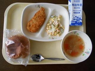 今日の給食は、セルフフィッシュバーガー(まるぱん、しろみさかなフライ、コールスローサラダ)、牛乳、ABCマカロニスープです。本日の給食で高根沢町で生産されたものは、にんじんです。今日もおいしく頂きました。