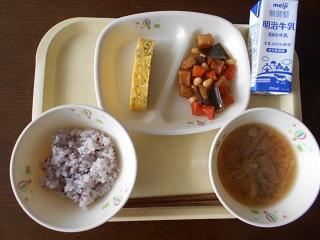 今日の給食は、くろむらさきまいいりごはん、牛乳、いろどりやさいのたまごやき、ごもくにまめ、いもがらいりみそしるです。本日の給食で高根沢町で生産されたものは、みそ、にんじん、だいこん、ねぎ、いもがら、くろむらさきまい、こめ、さといもです。今日もおいしく頂きました。