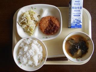 今日の給食は、ごはん、牛乳、ハムカツ、つぼづけあえ、じゃがいもとわかめのみそしるです。高根沢町で生産されたものは、味噌、キャベツ、玉ねぎ、じゃがいも、こめです。今日も、たいへんおいしく頂きました。