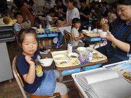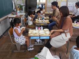 1年生は、親子ふれあい活動の後に、親子給食を実施しました。お父さんやお母さんといっしょに食べる給食は、とてもおいしそうに見えました。