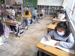 4月8日(水)に、無事始業式が実施できたと思った矢先に学校は臨時休業になってしまいました。そこで、御家庭でどうしても都合がつかず、子どもだけで過ごすことになってしまう場合に限り、保護者の送迎と自習ができることが前提で、学校でお預かりすることになりました。基本的には、「三密」に十分配慮して、学校の日課と同じ時間で自分が持参した教材で自習しているのを教職員が見守っているという形です。子どもたちは、しっかり自習に取り組んでいました。(中央タイムの時間は、いつも通り外遊びをしました。)