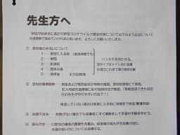 臨時休業延長の連絡の時に、学校再開に向け、学校生活が円滑にスタートできるようにするため、登校日が設定されることは一斉メールやホームページでお知らせしました。日時等が決まり、レターパックで通知を送付しましたのでご確認の上、対応をよろしくお願い致します。