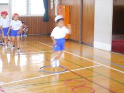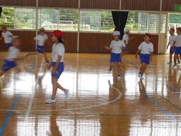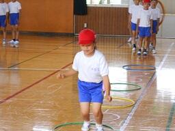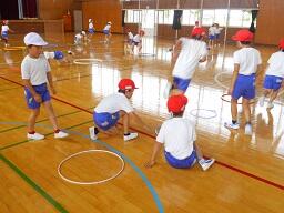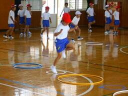今日の2時間目に、2年生の体育の授業も見てきました。「ケン・ケン・パ、ケン・パ、ケン・パ、ケン・ケン・パ」のリズムに合わせて輪をとぶ活動をしていまいた。途中で自分たちで輪の幅を変えたりして、みんなとても楽しそうに取り組んでいました。(暑さ指数(WBGT(湿球黒球温度)を計測して実施しています。)