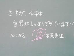 今日の3時間目から4時間目にかけての、歯科検診のため自習になっていた4年生の様子を見ました。静かに自習ができていて、しかも3時間目が終わり、4時間目がスタートするときにはまたしっかり席に戻ることができていました。素晴らしいので、黒板に一言残しておきました。また先日お知らせした素晴らしい掲示物のところには、昨日の校外学習の態度がとてもよかったので掲示物が増えていました。担任が戻ってきたときに、担任から褒められ、みんなで小さな声で万歳をしていました。がんばっている4年生です。