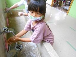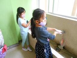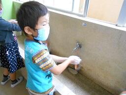 3 校舎に入る前に、昇降口北側にある水道で石けんを使って手洗いをお願いします。
