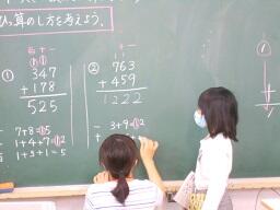 今日の1時間目に、2年生の算数の授業も見てきました。「長さのけいさんができる」というめあてで授業が展開されていました。同じ単位のものを計算すると言うことが、ほとんどの児童が理解でき計算を進めていました。