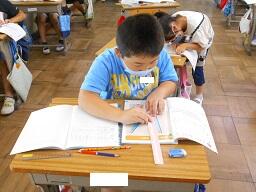 今日の2時間目に、2年生の算数の授業を見てきました。竹尺を使って、10㎝の直線を引くという作業を行っていました。大人にとっては簡単なことですが、子どもにとっては竹尺がずれてちょっと難しそうでしたが、みんながんばって引いていました。