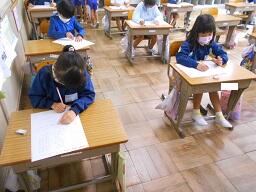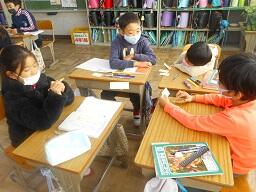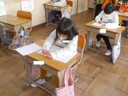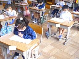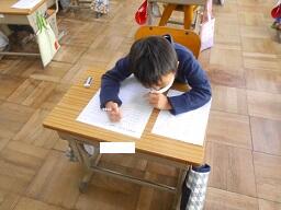 今日の1時間目に、1年生の国語の授業を見てきました。以前お知らせした「しらせたいな、みせたいな」の単元で、知らせたいことを絵で描き終わり、説明する文章を書いていました。みんなとても文字が上手になってきました。