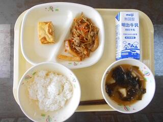今日の給食は、大嘗祭記念給食で、ご飯(とちぎの星)、牛乳 、厚焼き卵、五目きんぴら、じゃが芋とわかめの味噌汁です。高根沢町で生産された物は、みそ、たまねぎ、こめです。今日もたいへんおいしく頂きました。