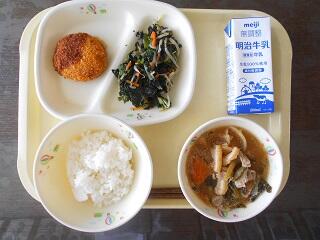 今日の給食は、かみかみメニューで、ご飯 、牛乳、あさのメンチカツ、のり和え、根菜のごま汁です。高根沢町で生産された物は、みそ、だいこん、こめです。今日もたいへんおいしく頂きました。