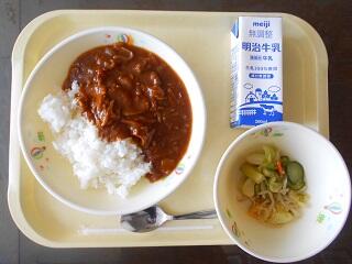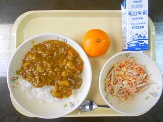 今日の給食は、ご飯、牛乳、ポークカレー、ごぼうサラダ、みかんです。高根沢町で生産された物は、にんじん、たまねぎ、こめです。今日もたいへんおいしく頂きました。